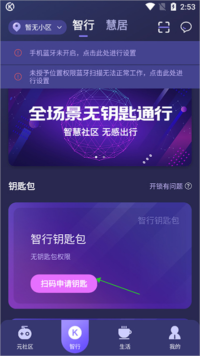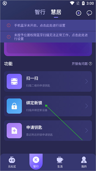1. 打开并登录乐开元社区App,进入【智行】页面,点击【慧居】,按提示开启手机蓝牙,随后点击【绑定新锁】;
