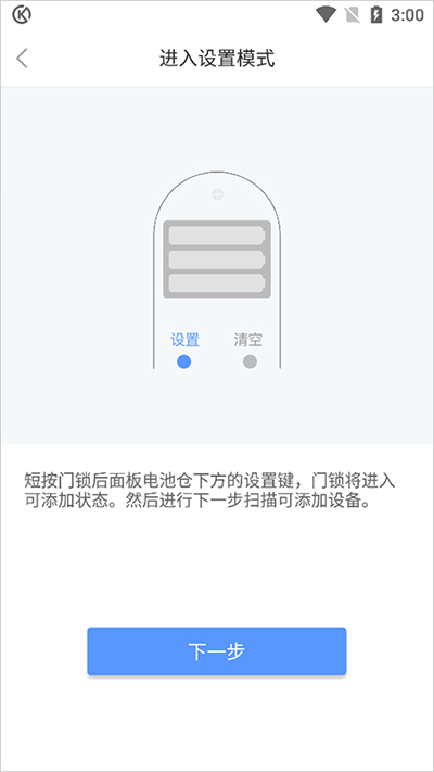 2. 根据页面指引,短按门锁后面板电池仓下方的设置键,使门锁进入可添加状态,然后点击“扫描设备”;