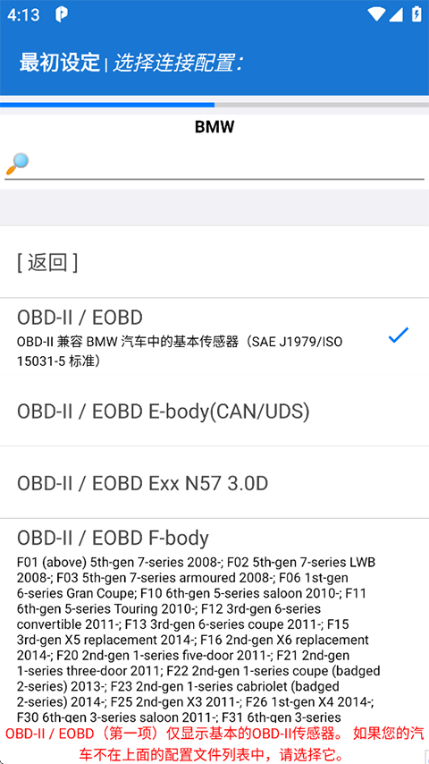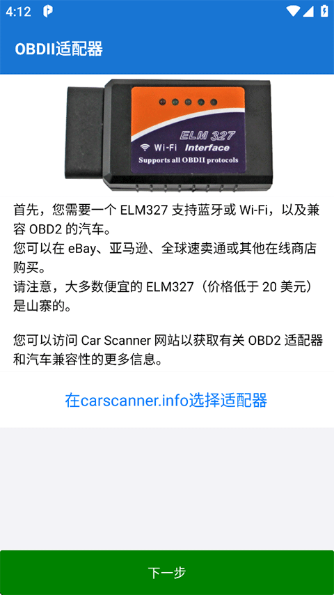 3. 准备一个基于ELM327芯片的OBD2适配器,并在列表中选择匹配的设备类型,点击下一步;