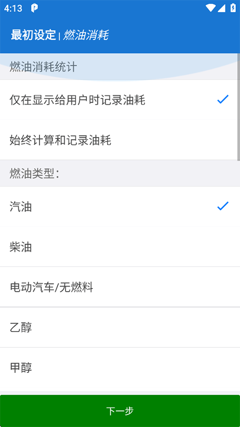 7. 设置燃油类型及油耗统计方式,点击下一步;