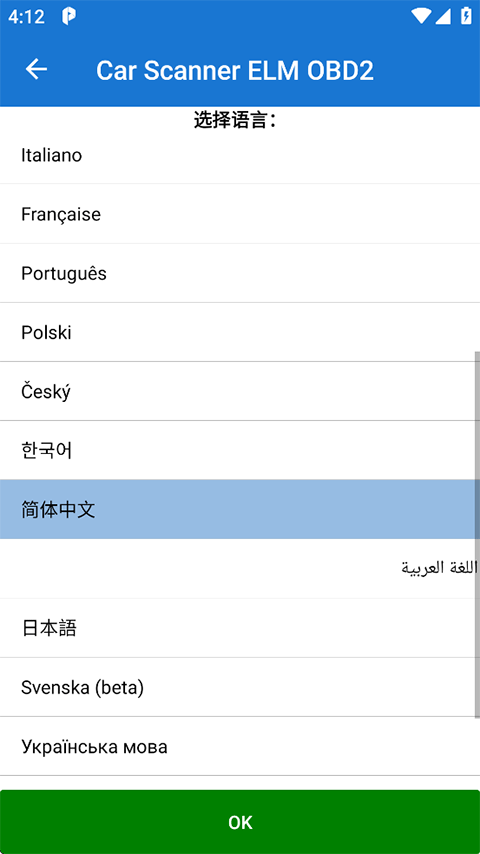 1. 打开Car Scanner汽车扫描仪软件,首先将操作语言设置为简体中文;