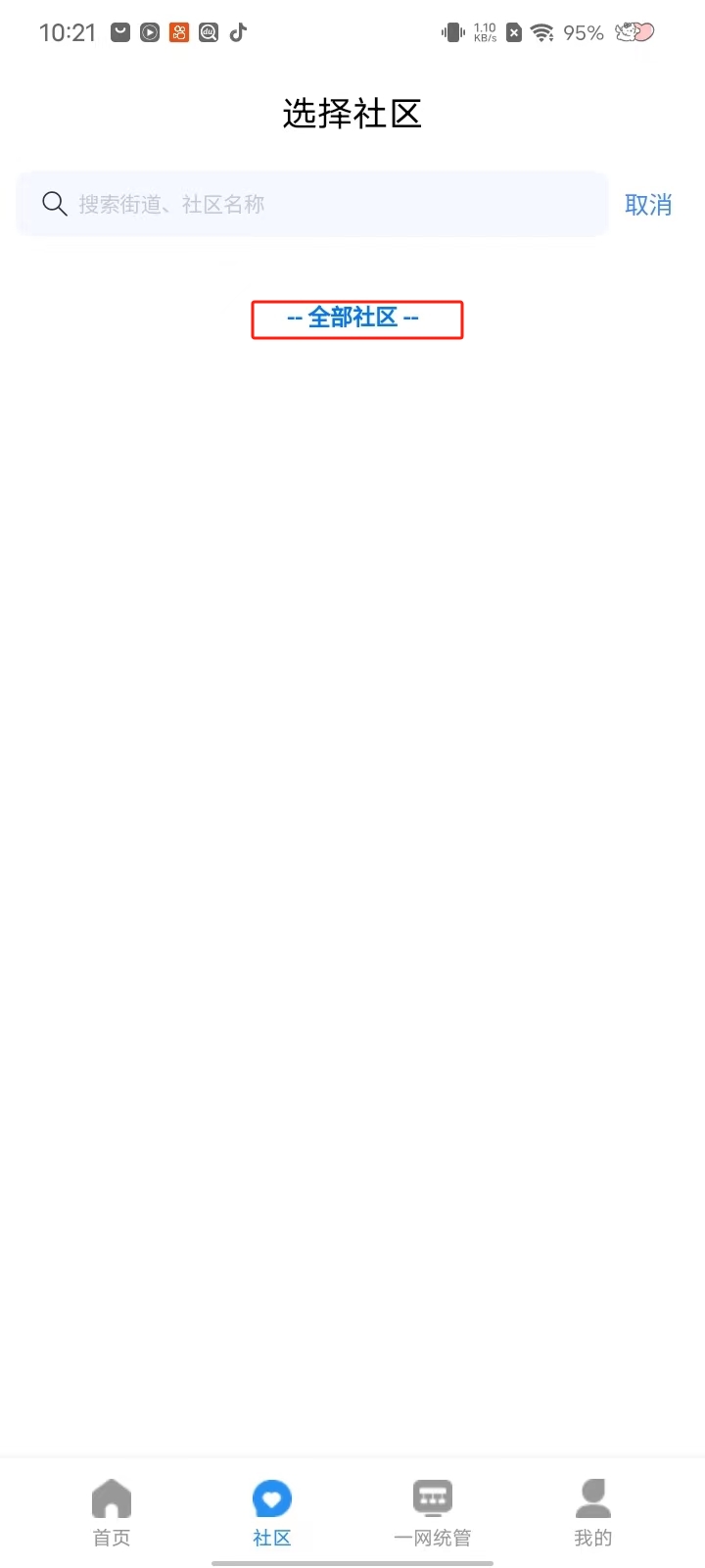 1、点击底部导航栏中的【社区】入口,进入后可选择【全部社区】或直接搜索您所在的社区、街道名称。