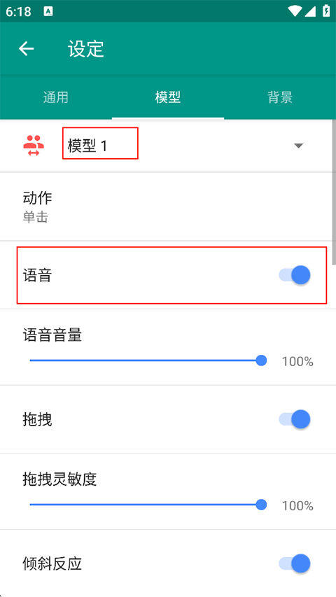 - 进入【模型】页面,开启【语音】右侧的开关(此处的“模型”即指角色,开启后角色将播放预设语音);