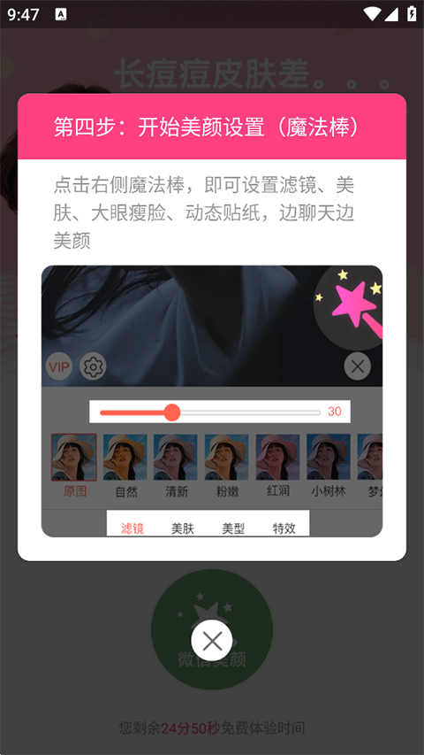 4、通过魔法棒面板自由设置美颜强度、滤镜风格及美肤参数,实现边聊边美化;