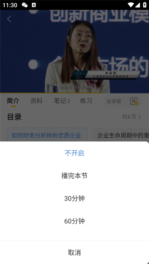 - 在弹出菜单中选择定时关闭时长,可选“播完本节”“30分钟”或“60分钟”后自动停止播放。