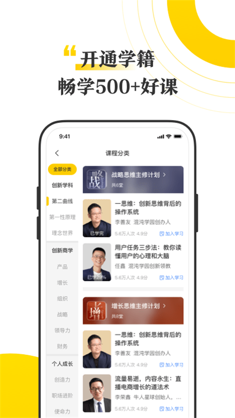 - 创新商学:涵盖增长、组织、战略、产品、领导力、财务六大模块;