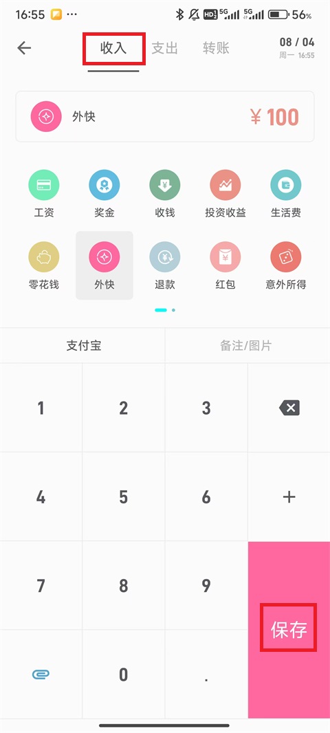 9. 同样地,点击左上角“支出”切换为“收入”,填写后点击“保存”即可记录收入项。