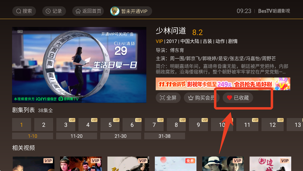 1. 在观看影片时,进入详情页,右侧下方可见【收藏】按钮。