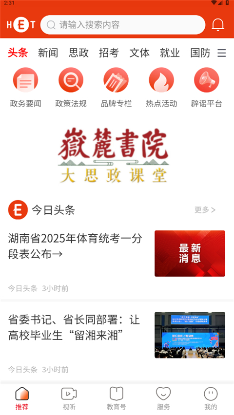 湖南教育发布App是由湖南教育电视台倾力打造的官方教育资讯服务平台,致力于第一时间将湖南省内教育相关的党政声音、政策法规及便民服务信息精准触达广大师生与家长。同时,平台通过图文、视频、直播等多元形式,全面呈现校园活动、师生风采与优质教学资源,有效实现政策宣导、理念传播、形象展示与网络育人一体化目标。