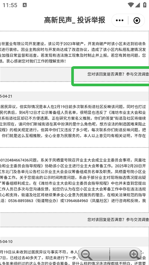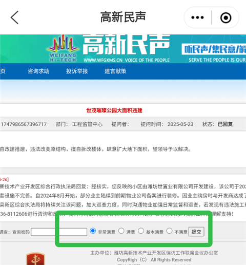 2. 在投诉举报页面,查看政府对群众反映问题的官方答复内容。