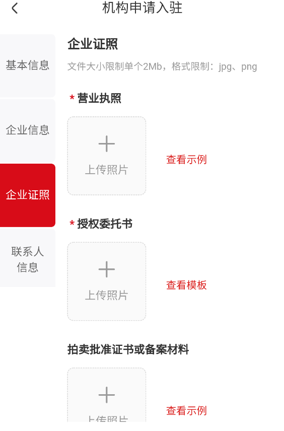 4. 上传必要资质文件,包括营业执照、授权委托书及拍卖业务批准证书。