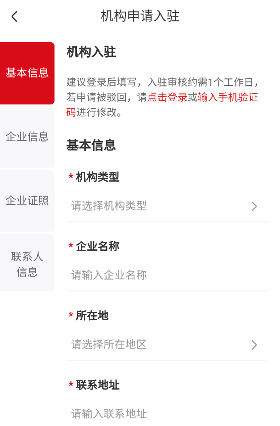 2. 填写机构基本信息,包括机构类型、企业名称、所在地及详细联系地址等。