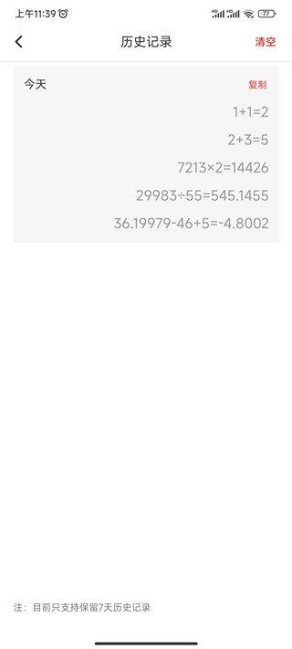 2、历史记录页面可随时查看过往计算内容,也支持一键清除,保护隐私;