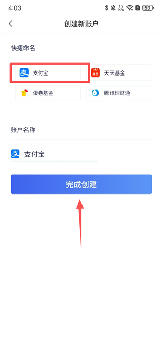2. 创建新账户,选择【支付宝】,点击【完成创建】。