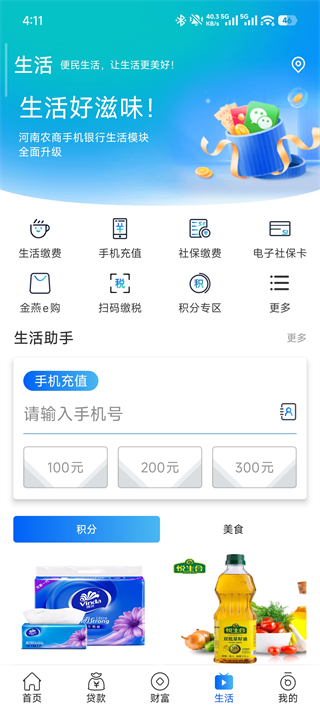 涵盖水电燃气缴费、手机充值、社保医保缴纳等便民服务,并接入金燕e购商城、扫码缴税、积分兑换等生活助手功能,打造一站式生活服务平台。