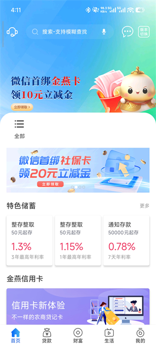 集中展示热销储蓄产品、金燕信用卡服务及高频金融入口,界面清晰,操作直达。