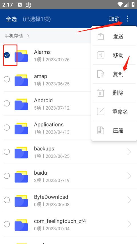 - 勾选需复制的文件,点击右上角三点菜单,选择【复制】;
