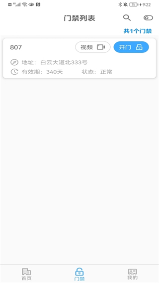 点击底部【门禁】选项,进入已授权门禁列表,可查看每处门禁的编号、地址、有效期及当前状态,并支持视频预览与一键远程开门操作。
