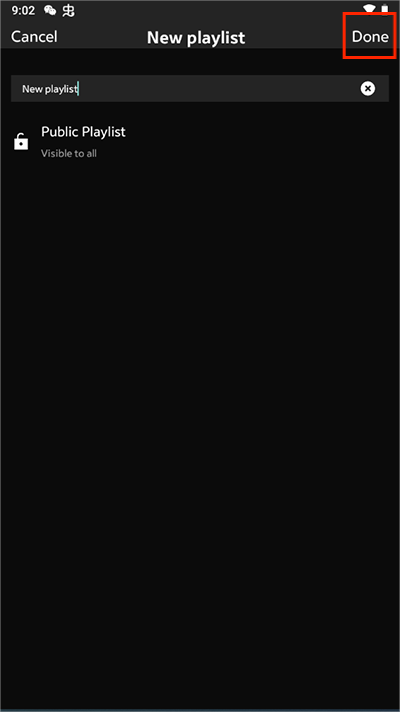 2. 输入歌单名称后点击“Done”,即可成功创建专属歌单。