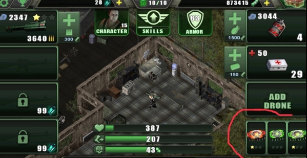 若第二关奖励不佳,建议重新安装游戏以刷新奖励池。角色界面右下角设有三个芯片插槽,推荐配置为1个红色芯片 + 2个绿色芯片:红色芯片提升血量(维持在400左右已足够),绿色芯片则显著增强攻击力与暴击率——后者几乎可保证每次攻击触发暴击,是输出核心。
