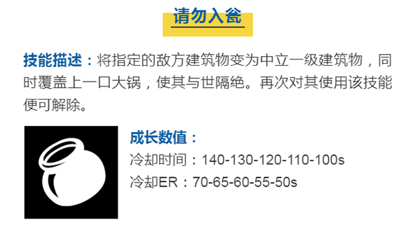 被技能“大锅”覆盖的建筑将无法被选中并转为中立。战场同一时间仅能存在一个大锅——第二次释放技能(无论目标为何),首个被覆盖建筑将立即解除状态。此外,该技能仅可对驻有敌方士兵的建筑使用,优先选择敌军密集区域以最大化削弱效果。