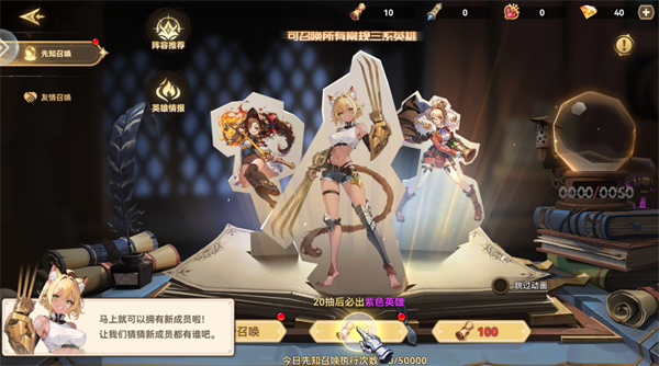通过“先知召唤”可获取常规三系英雄,累计20抽必得紫色品质英雄,是前期组建强力阵容的核心途径。