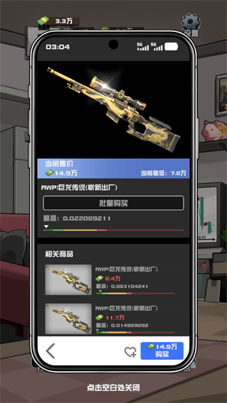 我在CS卖饰品是一款以CS:GO饰品交易生态为蓝本打造的模拟经营手游。玩家将化身一名负债累累的饰品商人,在充满变数的虚拟市场中通过低买高卖、囤货套利、开箱炼金等策略手段谋求翻身。游戏内饰品价格随时间动态波动,行情瞬息万变,盲目跟风或判断失误极易导致资金链断裂。唯有精准把握市场节奏、合理分配有限资金,并巧妙搭配各类增益效果,才能在规定周期内还清债务,实现资产逆袭。