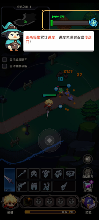 开启“自动战斗”解放双手,专注走位与时机把控;血量危急时及时使用“治疗瓶”保命。同时注意场景中的关卡进度条——击杀怪物可填充进度,集满后激活传送门,顺利进入下一区域。