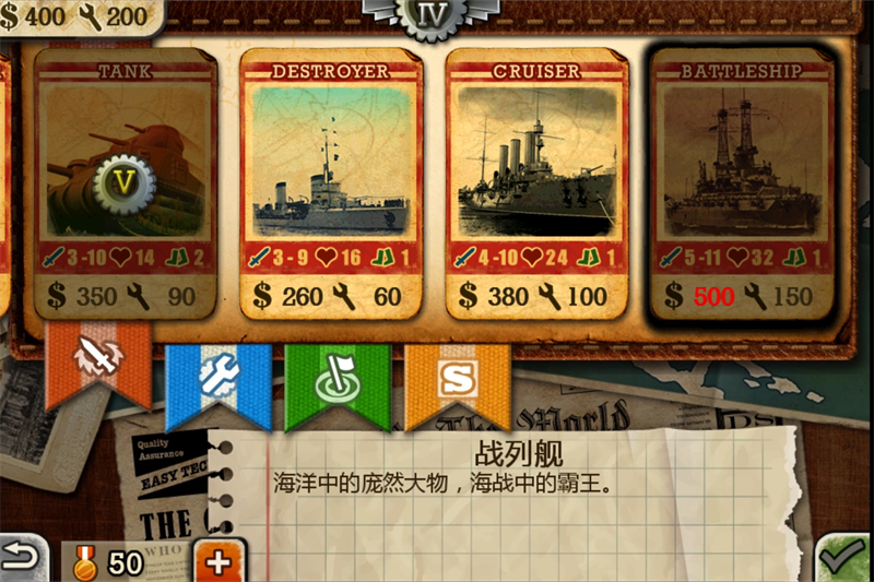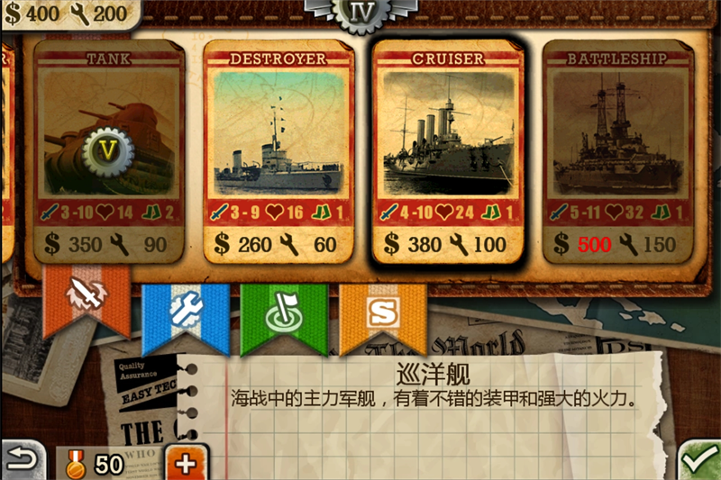 • 巡洋舰:中型海上主力,战斗力均衡,造价高于驱逐舰,移动力为1。