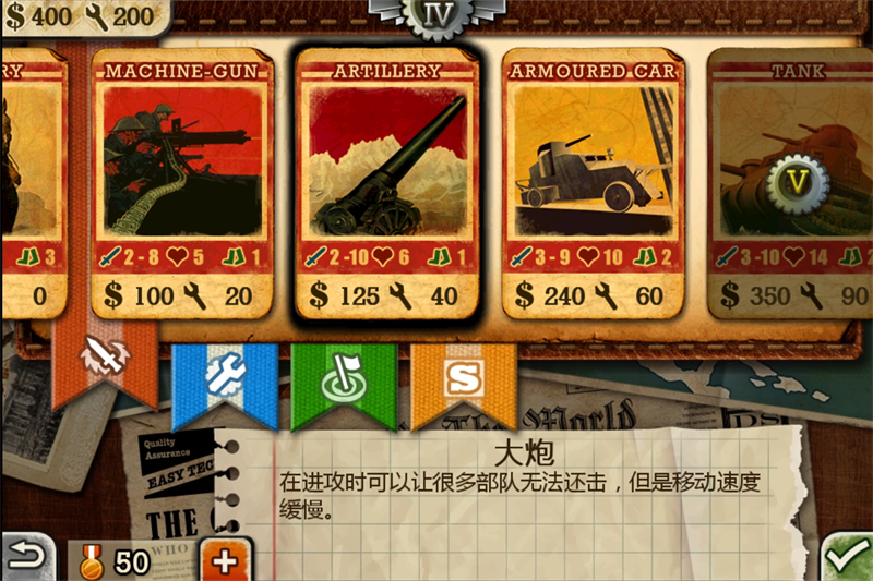 • 大炮:远程压制利器,攻击陆上单位时(坦克除外)敌方无法还击;但无法占领已清空敌军的区域。移动力为1,需在一级及以上工业区生产。