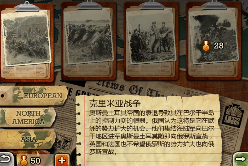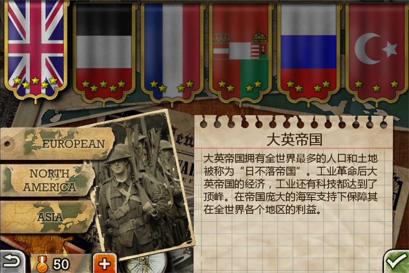 自由选择任一国家,在亚洲、欧洲与美洲三大洲展开全球争霸,制定外交策略、扩张领土版图,争夺世界霸权。