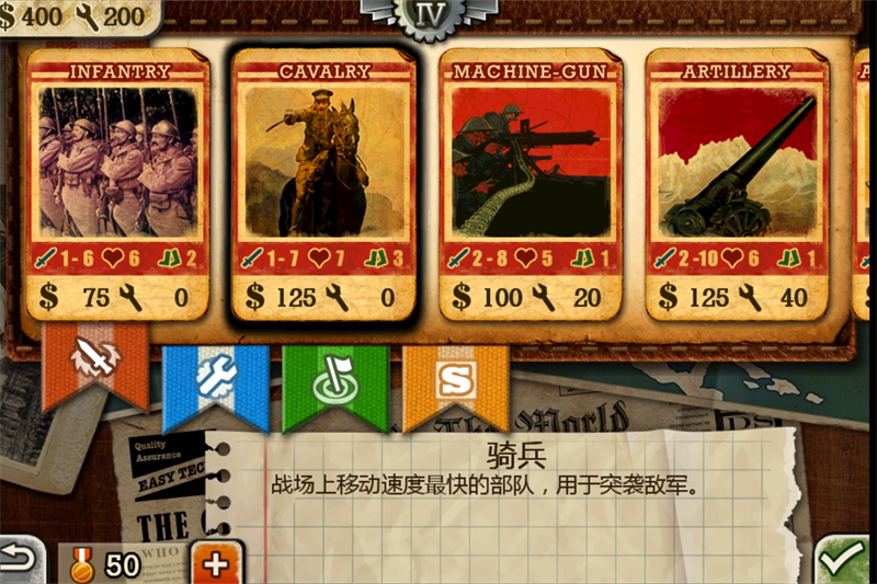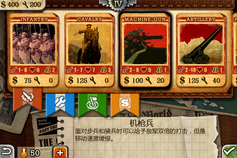 • 机枪兵:全新反制型单位,对阵步兵或骑兵时可触发双重伤害反击机制,但生命值偏低。移动力为1,需在二级及以上工业区生产。