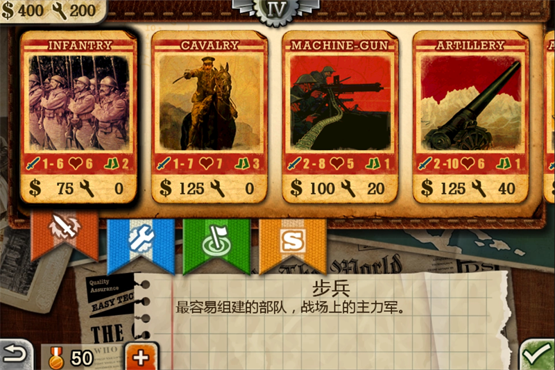 • 步兵:最基础且成本最低的陆军单位,攻击力较弱但部署灵活。移动力为2,可在三级及以上城市或一级工业区生产。