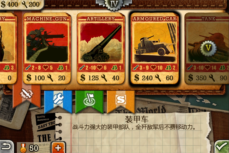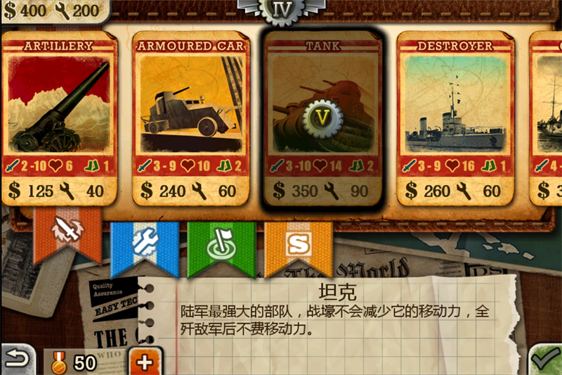 • 坦克:终极陆战兵器,拥有顶级攻击力与生命值,具备连续攻击、无视战壕、反制大炮三大优势,唯独造价极其高昂。移动力为2,仅限三级工业区生产。