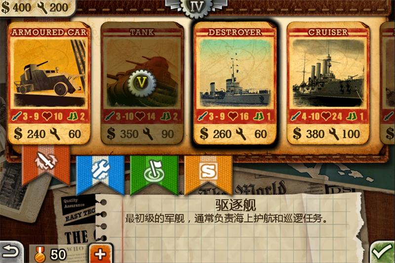 • 驱逐舰:海军入门单位,成本低廉但战斗力有限,移动力为1。
