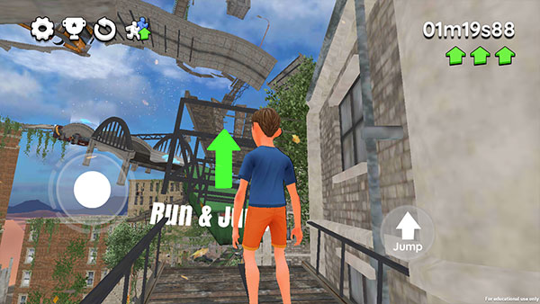 2、基础操控:左下角虚拟摇杆控制移动,右下角“Jump”按钮实现跳跃,滑动屏幕自由调整视角;沿地面淡绿色荧光路径行进可避免迷失方向。