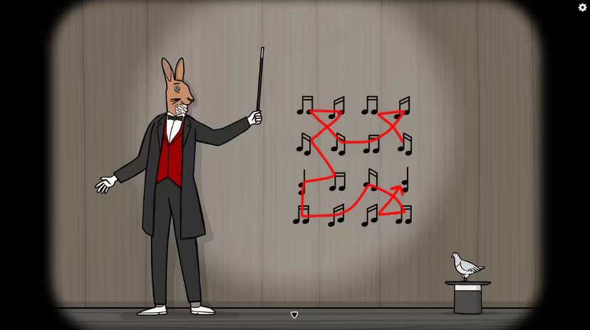 点击帽子→鸽子→音符;按音符符号指示的方向连续点击相邻音符: