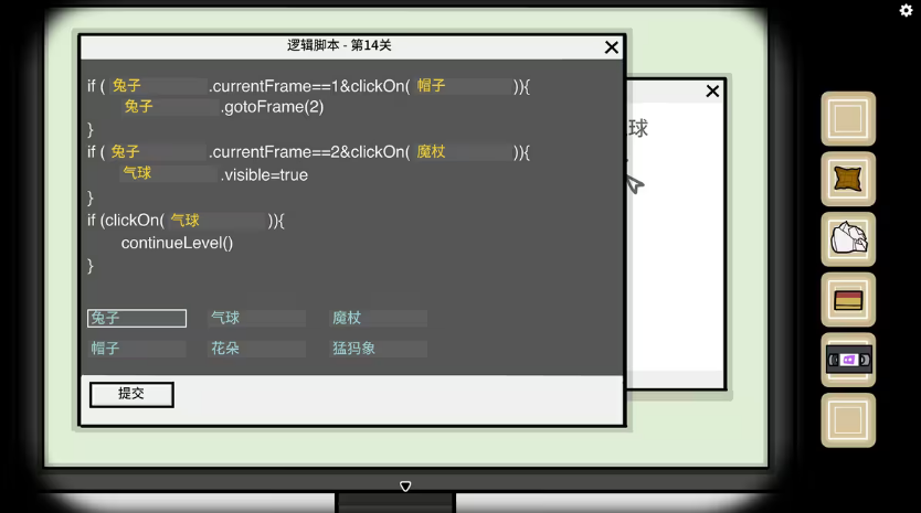 4. 协助Debug:根据草稿逻辑,编写代码使兔子在点击帽子→魔杖→气球后正确切换帧;