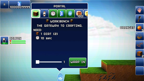 3. 工作台建造流程:需先制造基础工作台(WORKBENCH),才能解锁后续生产设施。具体步骤为:收集所需材料(如1单位DIRT泥土),返回出生点光圈处点击,选择制造选项即可生成工作台。完成后,工作台会出现在右侧栏,点击后角色将携带它,再点击地面任意位置即可放置。后续如工具台(TOOL BENCH)等高级工作台,则需通过已放置的工作台进行制作。