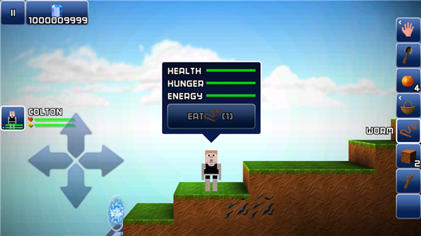 2. 采集资源方法:在右侧工具栏中选择操作方式——可直接用手,也可使用初始赠送的铲子,或通过工具台(TOOL BENCH)制作更高效的工具。选定后点击树木或土地,角色便会开始伐木或挖土。