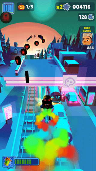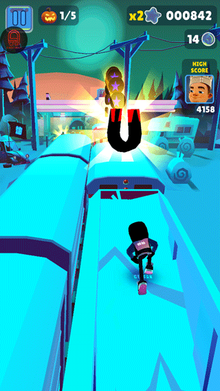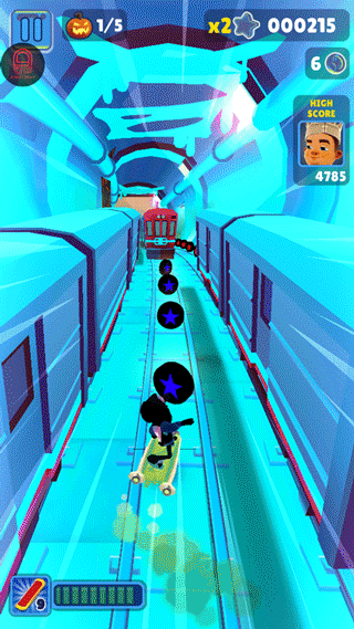 滑板:双击屏幕即可激活,提供一次“免死”机会。即使撞上火车或障碍,滑板会消失但游戏继续。滑板消失后有短暂闪烁冷却期,结束后可再次启用,每局不限次数。
