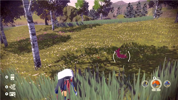 蹲伏于草丛可激活“潜行”状态,避免被宝可梦察觉。按下ZR键即可投掷精灵球进行捕捉,无需强制进入战斗。随着调查队星级提升,可解锁高级球、巨重球等高捕获率球种: