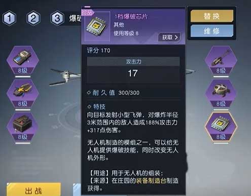 功能装备——无人机于10级解锁,拥有六个模块位,可装配输出、续航、机动等类型模块。模块分品级与特效,如火箭弹、机枪、电磁爆破或治疗功能,极大拓展战术维度。