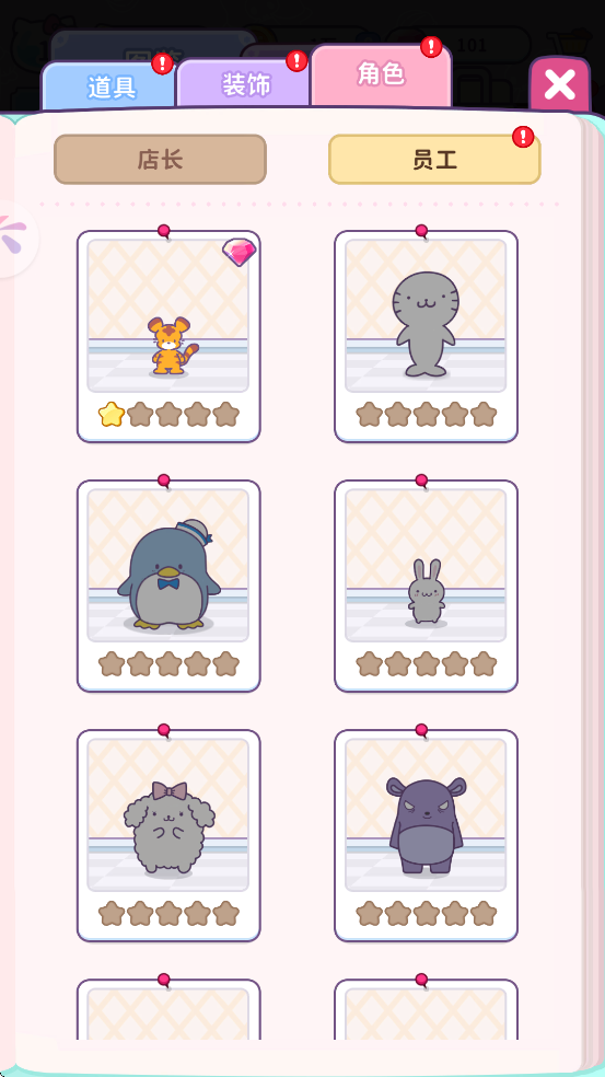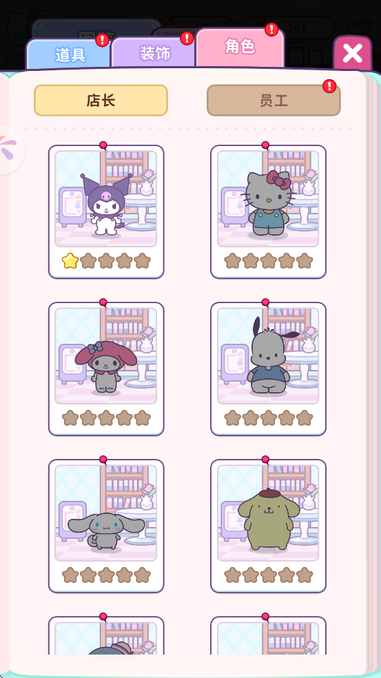游戏中角色分为两大类型:店长角色与员工角色,均源自广受欢迎的三丽鸥家族。