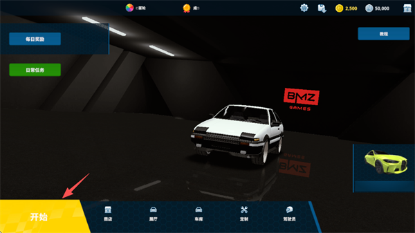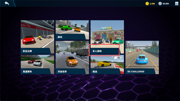 1. 进入主界面后,点击“开始”按钮,系统将展示多种赛车模式:生涯、直线加速赛、快速赛、开放世界及多人游戏等。