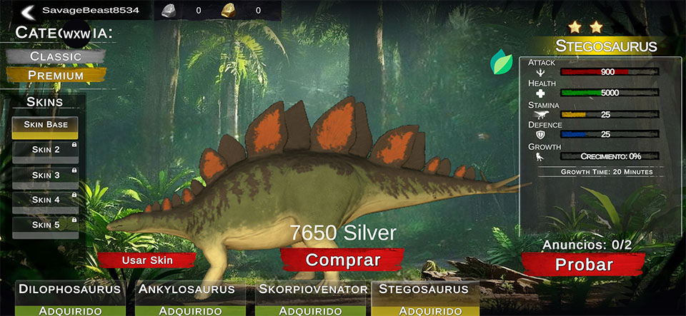 在恐龙商店中,使用银币购买新物种(如剑龙需7650银币),还可为已拥有的恐龙更换皮肤。所有已解锁恐龙均支持点击“Probar”按钮进行试玩,提前感受其移动速度、攻击方式与特殊能力。