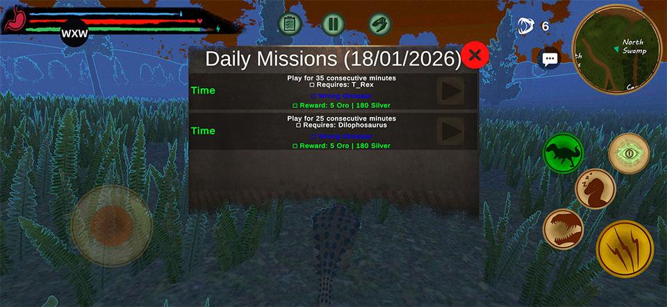 系统每日发布指定任务,例如“使用霸王龙或双脊龙游玩15分钟”,完成后即可领取银币、金币等奖励,有效加速恐龙解锁与成长进程。