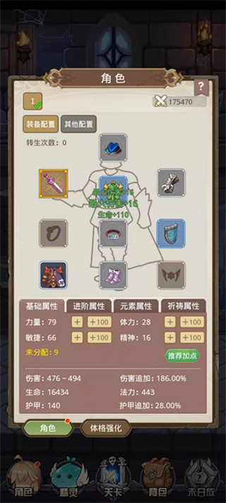 《小小勇者》中角色拥有四大基础属性:力量、体力、敏捷和精神。每提升一级即可获得1点属性点,前期升级迅速,加点充裕,且支持批量分配(如一次加100点),操作便捷。
