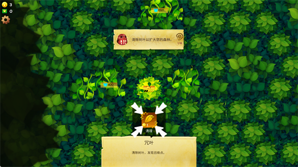 点击覆盖区域的「冗叶」进行清理,逐步扩大可探索范围,解锁新的召唤点与花种位置,为吸引蝴蝶奠定基础。