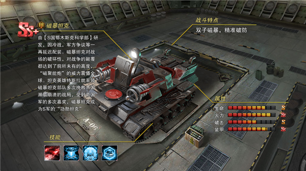 磁暴坦克由【S国鄂木斯克科研机构】打造,因冷战局势与军方内部争议,装备计划多次被推迟。该坦克搭载的“磁聚能炮”对战场环境具备颠覆性破坏力,首次亮相便引发全球震动。在坦克英雄特斯拉的率领下,磁暴部队多次扭转帝国濒临崩溃的战局,被授予“功勋坦克”的最高荣誉称号。
